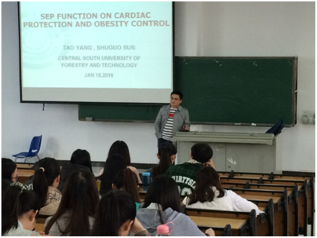 1月15日上午,中南林业科技大学在线买世界杯平台副院长杨涛副教授,在5教414为世界杯食品科学与工程专业2013级学生讲授《食品营养学》。食品学院申铉日副院长为杨涛老师颁发“在线买世界杯平台2016冬季小学期授课外聘专家”证书。学院部分专业教师和研究生聆听了杨老师的授课。