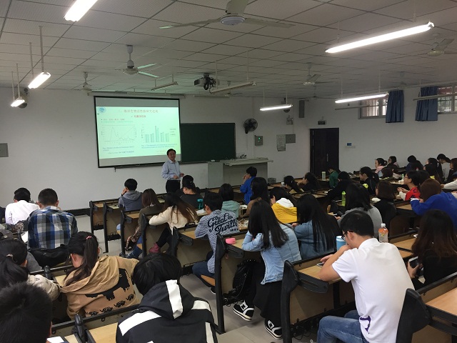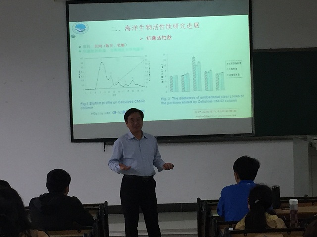 在“水产品保鲜技术研究进展”报告中,曾教授介绍了低温保鲜技术、冰温气调保鲜技术、微酸溶解平衡技术、生物保鲜技术、QS靶点技术以及其他保鲜技术的研究进展,展望了保鲜技术的发展趋势。在“海洋生物活性肽研究进展”报告中,报告了海洋生物源促矿物质(铁、钙和锌)吸收肽、抗病毒肽、降血压肽、抗氧化肽、抗菌肽等的制备、构效关系、活性及其修饰技术的研究进展,介绍了海洋生物活性肽产品的开发,展望了海洋生物活性肽的发展趋势。报告引起了师生的极大兴趣,同学们认真聆听,踊跃提问,并就相关问题与曾教授进行了更深层次的互动交流。曾教授讲解深入浅出,以其渊博的学识和亲切的互动感染了在座的每一位师生,获得了同学们的一致好评。