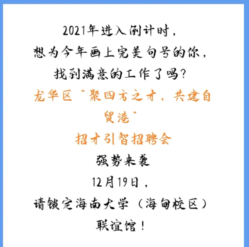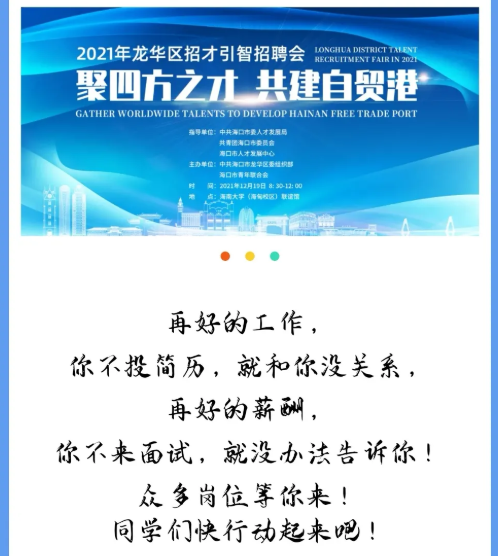 海口市龙华区2021年招才引智招聘会(在线买世界杯平台专场)定于12月19日(本周日)上午08:30-12:00在联谊馆举行,此次参会单位包含了外国政府驻华机构、国企、民营企业等36家用人单位单位,提供的岗位年薪均在6万以上,请大家积极参加!