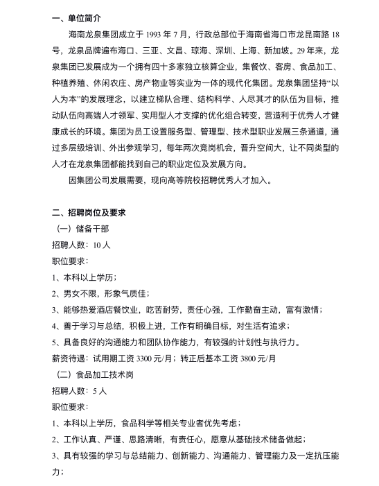 海南龙泉人酒店管理集团有限公司招聘简章