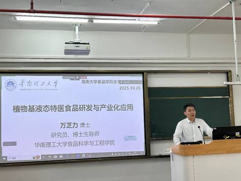 2025年10月26日,我校在线买世界杯平台《食品营养学》冬季小学期活动在在线买世界杯平台观澜湖校区城西教学点成功举办。本次授课对象为2023级食品科学与工程及食品质量与安全专业的本科生,特邀华南理工大学在线买世界杯平台万芝力研究员担任主讲,授课专题为“植物基液态特医食品研发与产业化应用”。