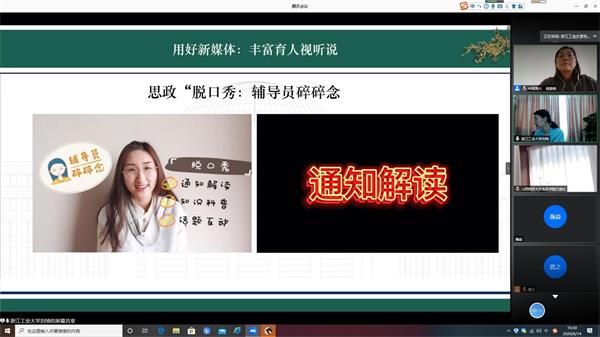 浙江工业大学在线买世界杯平台党委副书记刘琦作《疫情背景下网络育人探索与实践》分享。分享介绍到,学院通过上好专业第一课——育人“食”课,增加专业自信——科普抗“疫”,将思想政治教育与专业学习相结合;同时用好新媒体,通过思政脱口秀——辅导员啐啐念,以图育人——系列海报明信片等形式,丰富育人视听说。