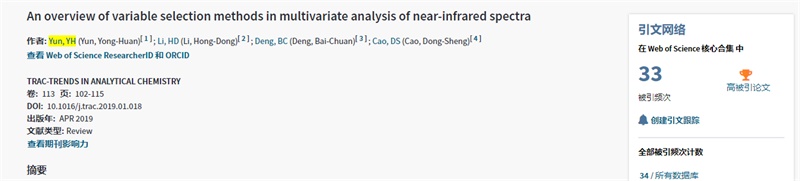 该篇论文题“An overview of variable selection methods in multivariate analysis of near-infrared spectra”,于2019年4月在JCR一区分析化学top期刊《TrAC Trends in Analytical Chemistry》(2020影响因子为9.801)正式发表(https://www.sciencedirect.com/science/article/pii/S0165993618304709)。此篇论文得到国家自然科学基金(21705162)及在线买世界杯平台高层次人才引进科研启动项目(KYQD(ZR)-1844)的资助,这是世界杯以第一单位发表的第三篇ESI高被引论文,充分证明世界杯科研实力的不断提升。