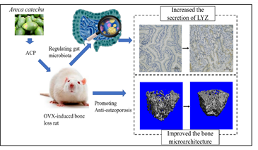 本研究采用去卵巢大鼠骨质疏松模型,探讨槟榔籽多酚(ACP)通过调节肠道微生物群改善骨质疏松的机制。分析了大鼠的骨微观结构、Paneth细胞、调节微生物蛋白(LYZ)、促炎细胞、巨噬细胞浸润水平和肠道微生物群落。与OVX相比,ACP改善了骨小梁的微结构,包括骨小梁数目(Tb.N)增加,骨小梁厚度(Tb.Th)增加,骨小梁间距(Tb.Sp)减少。在门水平上,拟杆菌门(Bacteroidetes)在卵巢切除后增加,硬壁菌门(Firmicutes)和变形菌门(Proteobacteria)在ACP中增加。低LYZ和Paneth细胞的抗骨质疏松组显示ACP组中对骨代谢有负面影响的Alistis菌群减少。研究表明,雌激素缺乏能够诱导Paneth细胞的脱落导致LYZ的减少,ACP可能会通过保持Paneth的数量增加LYZ表达的来调节肠道微生物群并通过抑制炎症反应改善骨质疏松症。