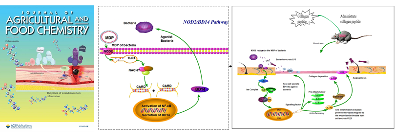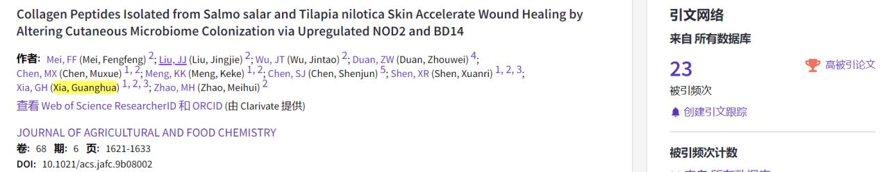 近日,根据ESI公布最新数据显示,在线买世界杯平台水产品加工与贮藏团队夏光华副教授课题组在农林科学SCI一区Top期刊《Journal of Agricultural and Food Chemistry》发表的封面文章“Collagen Peptides Isolated from Salmo salar and Tilapia nilotica Skin Accelerate Wound Healing by Altering Cutaneous Microbiome Colonization via Upregulated NOD2 and BD14”入选全球前1% ESI高被引论文。