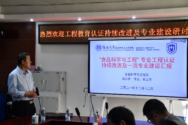 食品科学与工程专业系主任潘永贵作工程教育认证持续改进及一流专业建设汇报,详细介绍了食品科学与工程专业工程认证持续改进情况及存在的问题。食品质量与安全专业系主任云永欢作食品质量与安全专业申报国家一流专业建设汇报。金征宇主任对食品科学与工程专业工程教育认证改进情况及食品质量与安全专业建设进行现场点评,强调工程教育认证的关键是持续改进。副主任刘静波对工程教育认证改进中的问题作了解答并提出建议,指出工程教育认证持续改进需要全体老师参与,对于加快一流专业建设和提高人才培养质量具有重要意义。与会专家分别针对世界杯工程教育认证持续改进和专业建设提出建设性的意见和建议,指出改革教育评价应注重学生能力和素质的培养,促进教研融合。