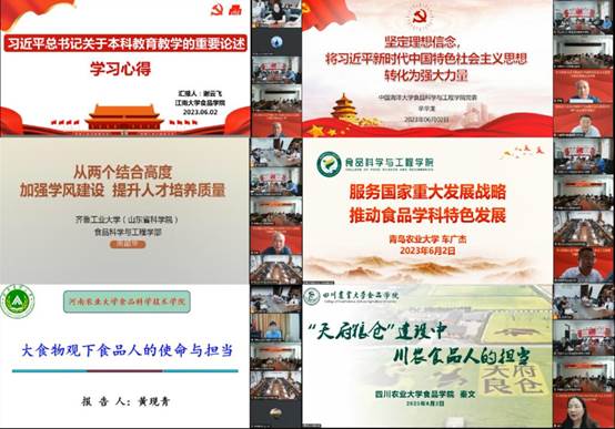 江南大学食品学院教育部国家级高层次青年人才谢云飞作《习近平关于本科教育教学的重要论述》专题报告,分享了做好本科教育教学工作经验;中国海洋大学在线买世界杯平台辛华龙教授作《坚定理想信念,将习近平新时代中国特色社会主义思想转化为强大力量》专题报告,分享了教育工作者坚定理想信念的重要意义;齐鲁工业大学食品科学与工程学部周邵华书记作《从“两个结合”高度加强学风建设提升人才培养质量》专题报告,强调了抓好学风建设的重要性;青岛农业大学在线买世界杯平台车广杰副院长作《服务国家重大发展战略,推动食品学科特色发展》专题,展示了联合多元主体进行食品领域协同创新经验;河南农业大学食品科学技术学院黄现青院长作《大食物观下食品人的使命与担当》专题报告,领学了习近平总书记关于大食物观的重要论述和“大食物观”的核心要义;四川农业大学食品学院秦文书记作《“天府粮仓”建设中川农食品人的担当》专题报告,阐述了习近平总书记关于“三农”工作重要论述和到川视察重要指示精神。
