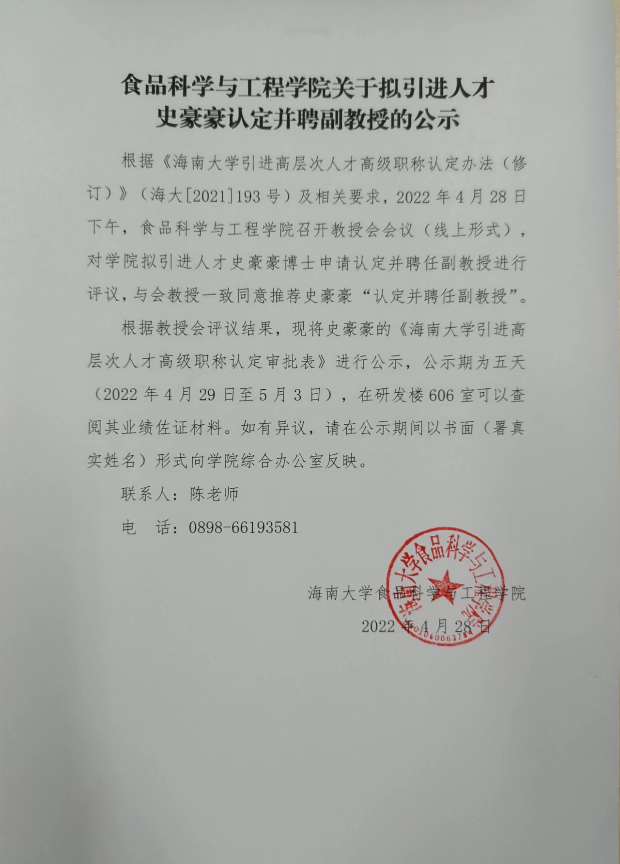 在线买世界杯平台关于拟引进人才史豪豪认定并聘副教授公示